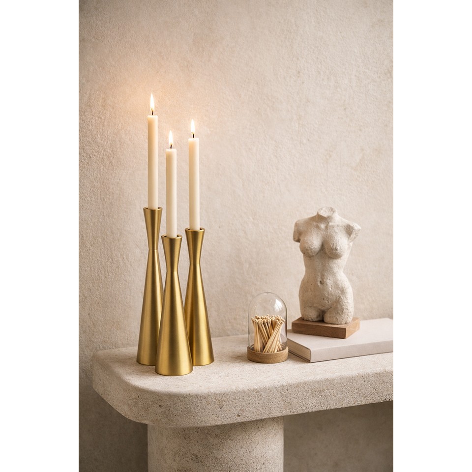 Zestaw 3 świeczników SHP TRIO złoty to stylowa dekoracja, która łączy prostotę z wyrafinowaną estetyką. Ich smukły, stożkowy kształt wprowadza do wnętrza lekkość i minimalistyczną harmonię, a nowoczesna linia sprawia, że świetnie prezentują się zarówno solo, jak i jako zgrana kompozycja.