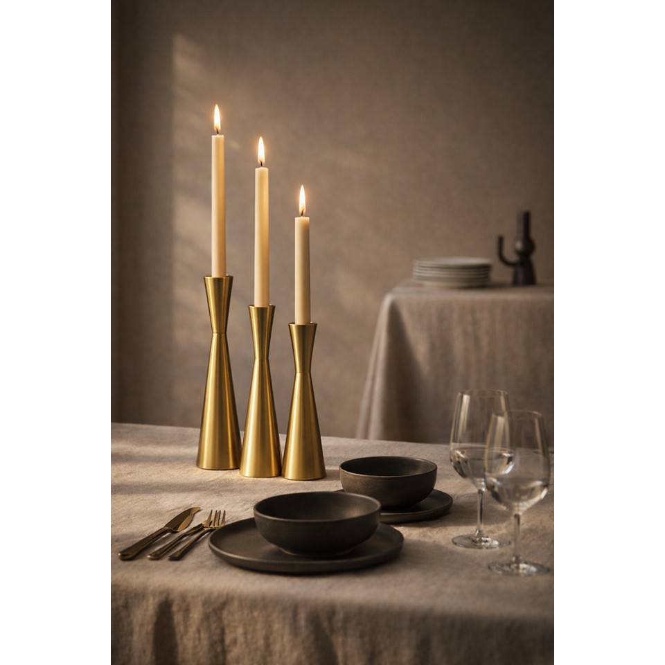 Zestaw 3 świeczników SHP TRIO złoty to elegancka, minimalistyczna dekoracja o smukłej formie, która dodaje wnętrzu subtelnego blasku i nowoczesnego stylu.